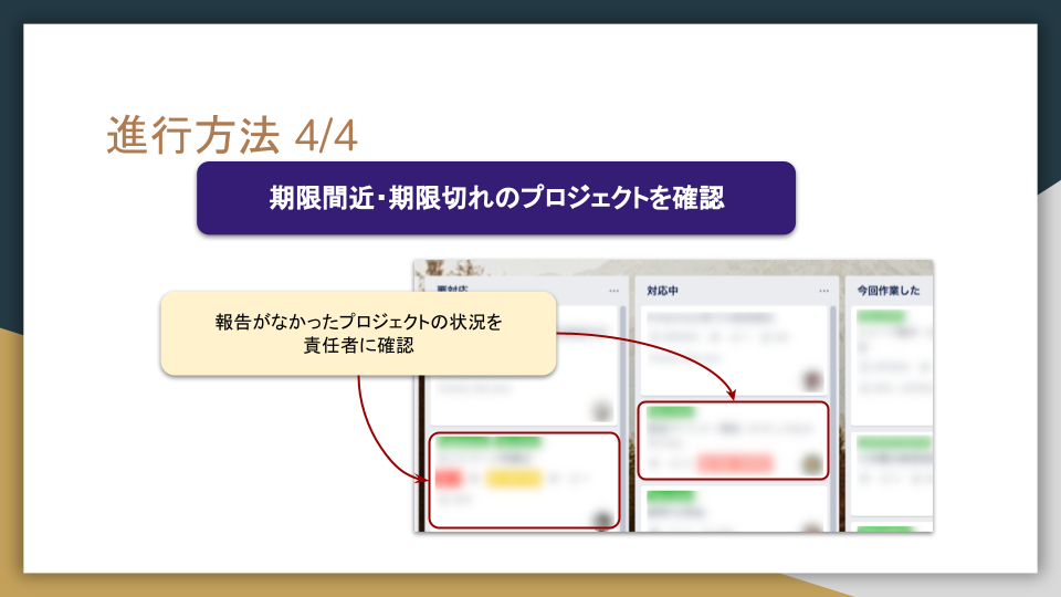 期限が迫っている、もしくは期限が過ぎたのにまだ完了していないものや「今回作業した」リストに入っていなかったものがあれば、責任者に状況を確認します。そこで期限を引き直すのか、やらないことにするのか等を決めます。